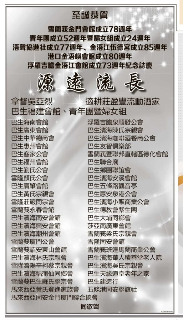 雪蘭莪金門會館慶祝成立78週年、青年團52週年暨婦女組24週年、浯聲協進社77週年,金浯江伍德宮85週年、港口金浯嶼會館80週年及浮羅吉膽金浯江會館73週年紀念聯歡晚宴
